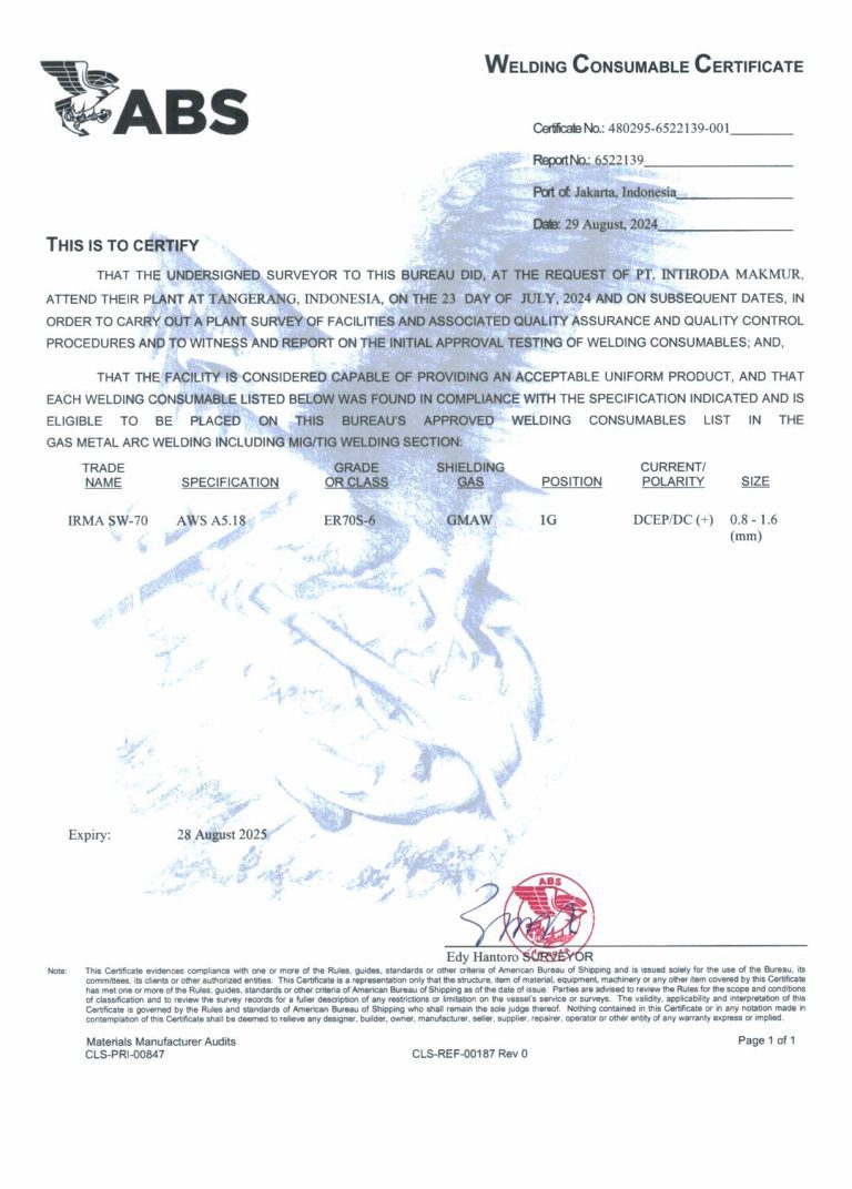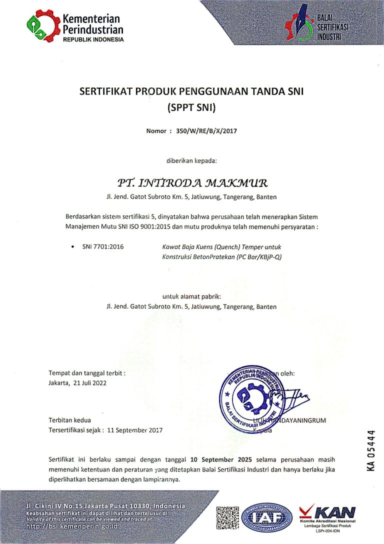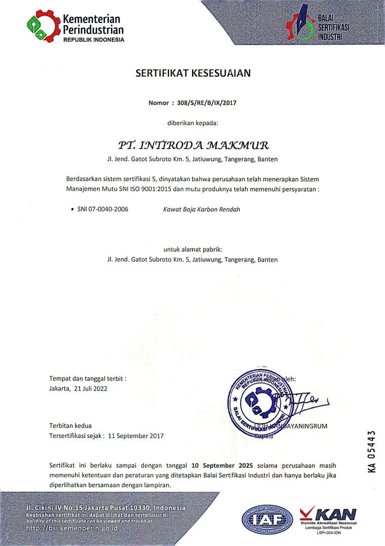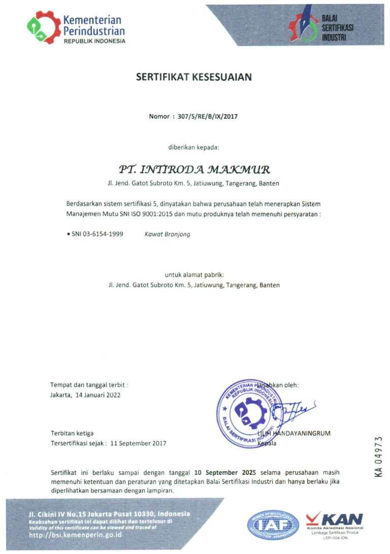 At PT INTIRODA MAKMUR, we take pride in upholding excellence and adhering to top industry standards. Our certifications showcase our commitment to quality, safety, and environmental responsibility, ensuring you receive only the highest standard products.